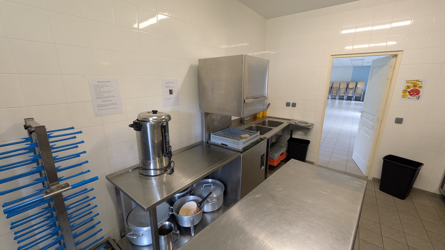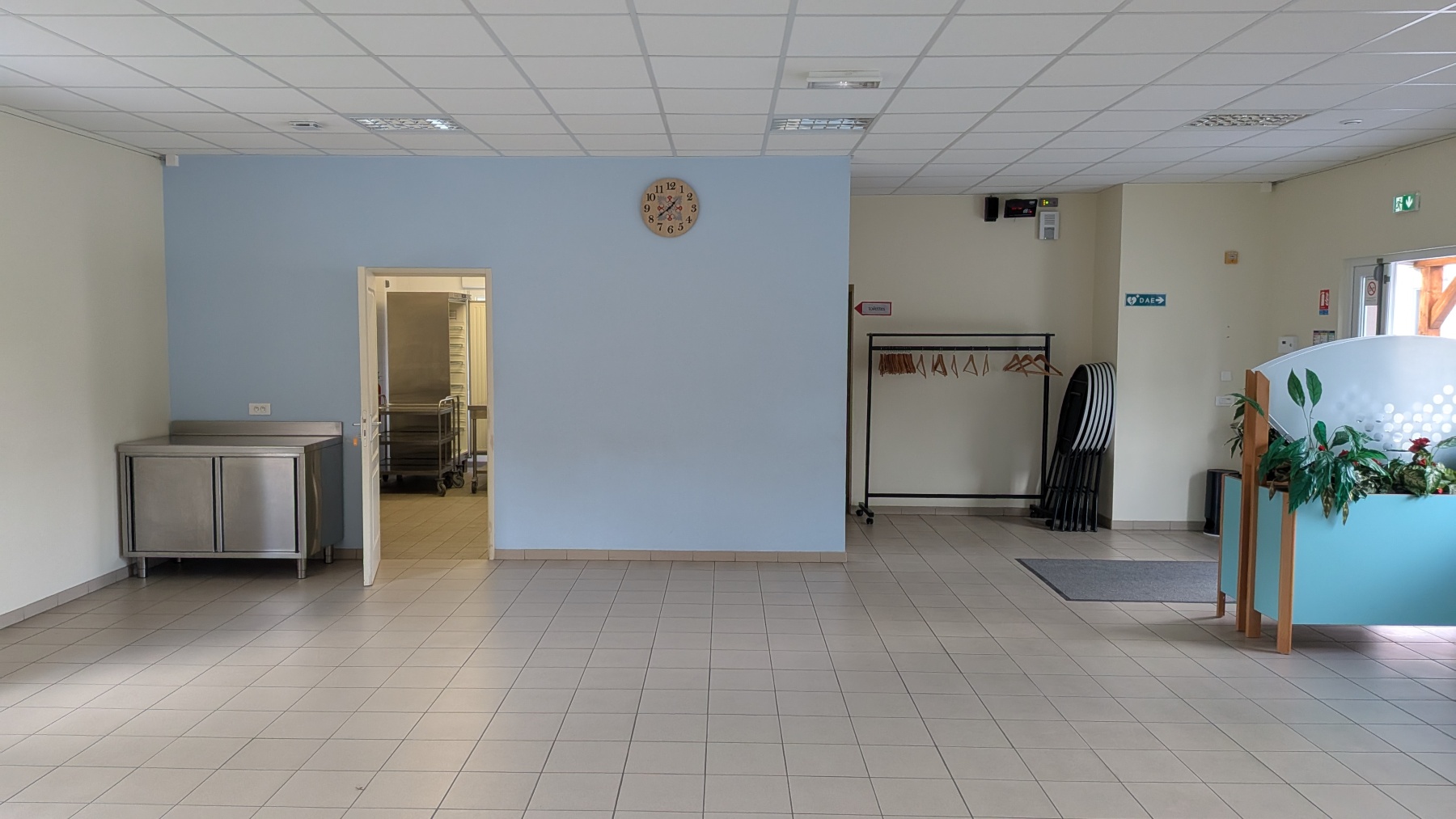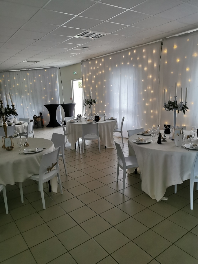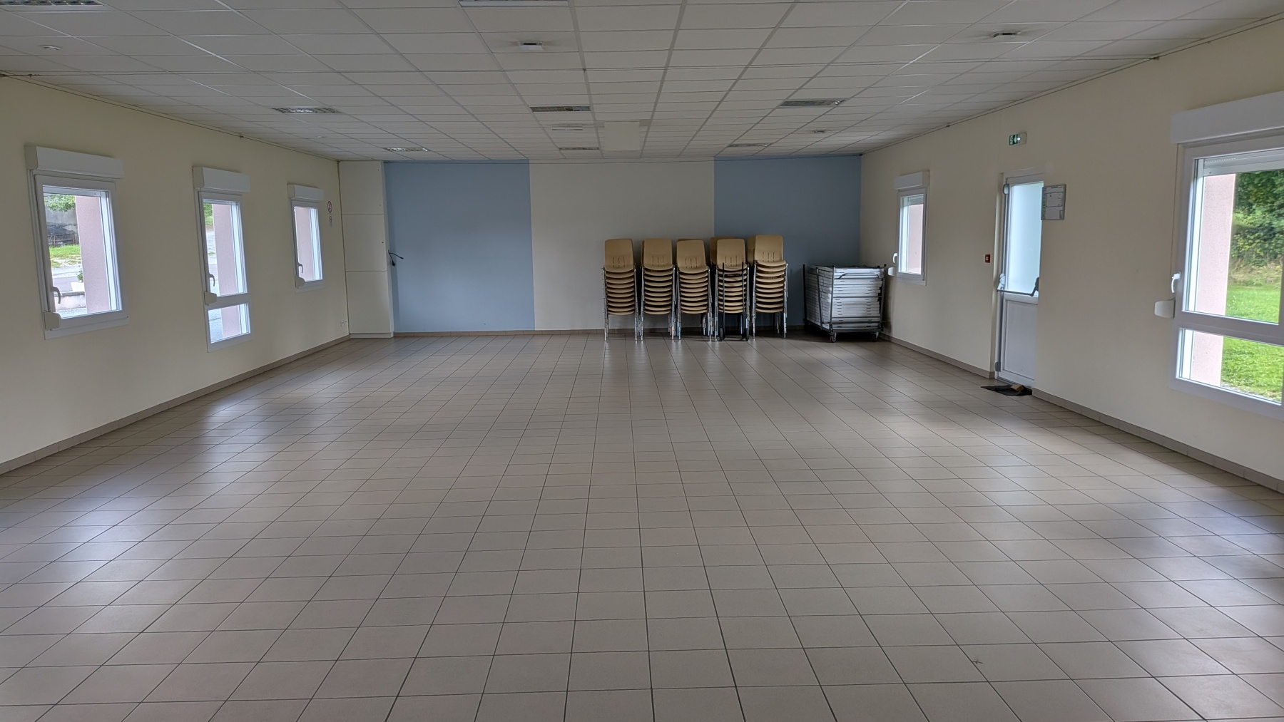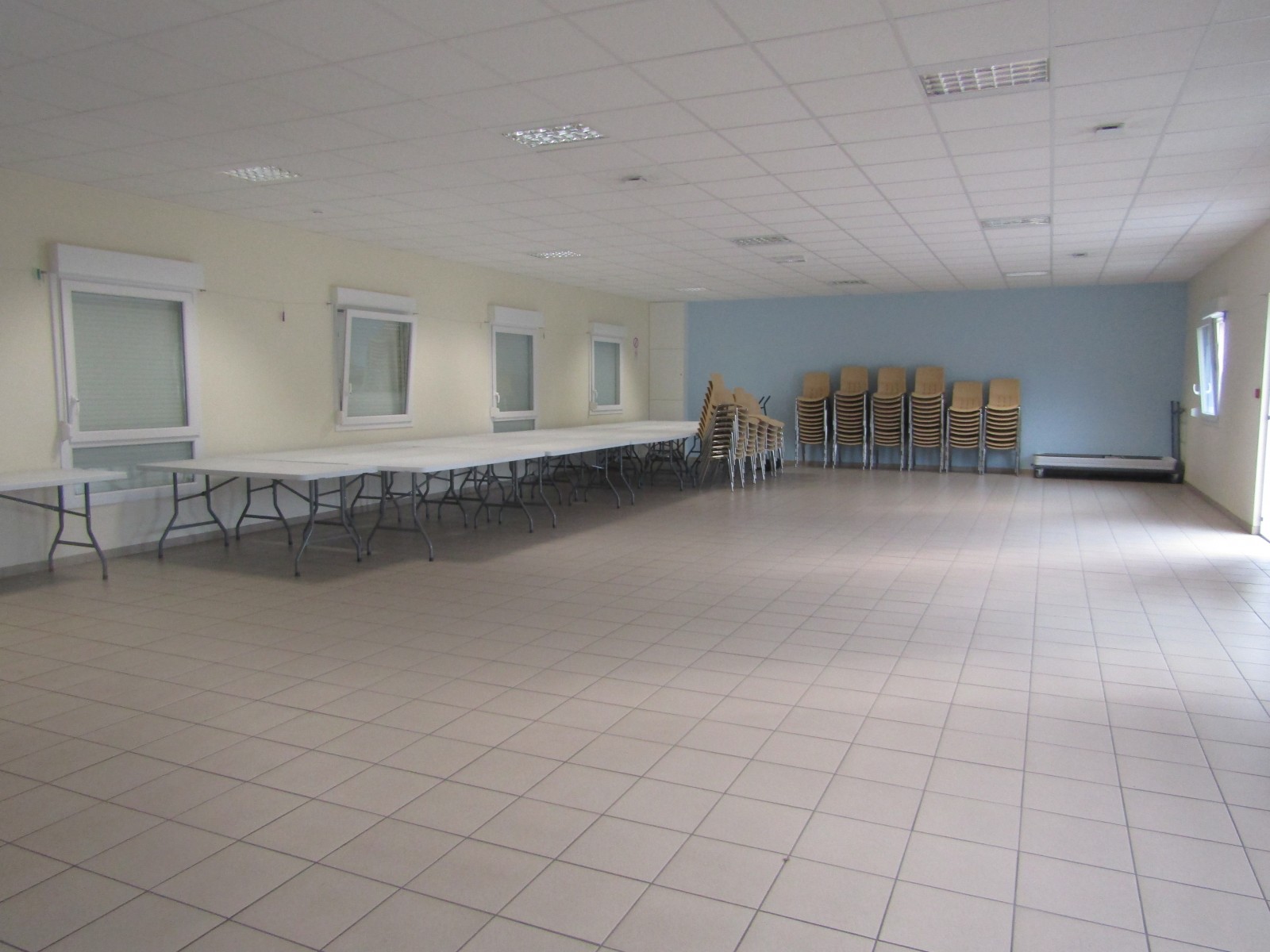 Nous vous proposons une salle pouvant accueillir jusqu’à 100 personnes. Elle est équipée de 20 tables et 100 chaises, d’une cuisine équipée (pour réchauffer) et de vaisselle pour 100 couverts.
